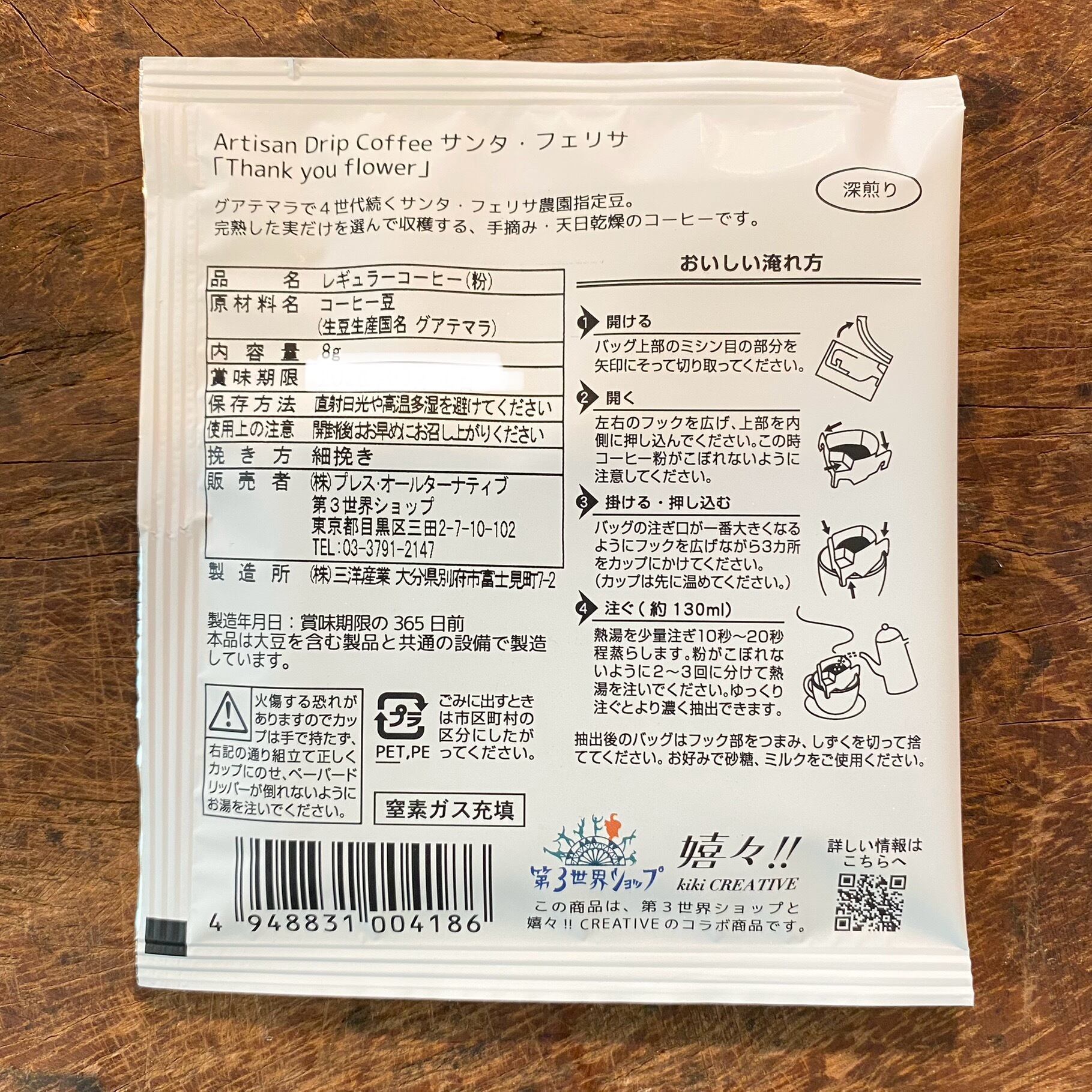 中身は、グアテマラ最上級グレード SHB のコーヒー豆を使用した、香り高い本格ドリップコーヒー。