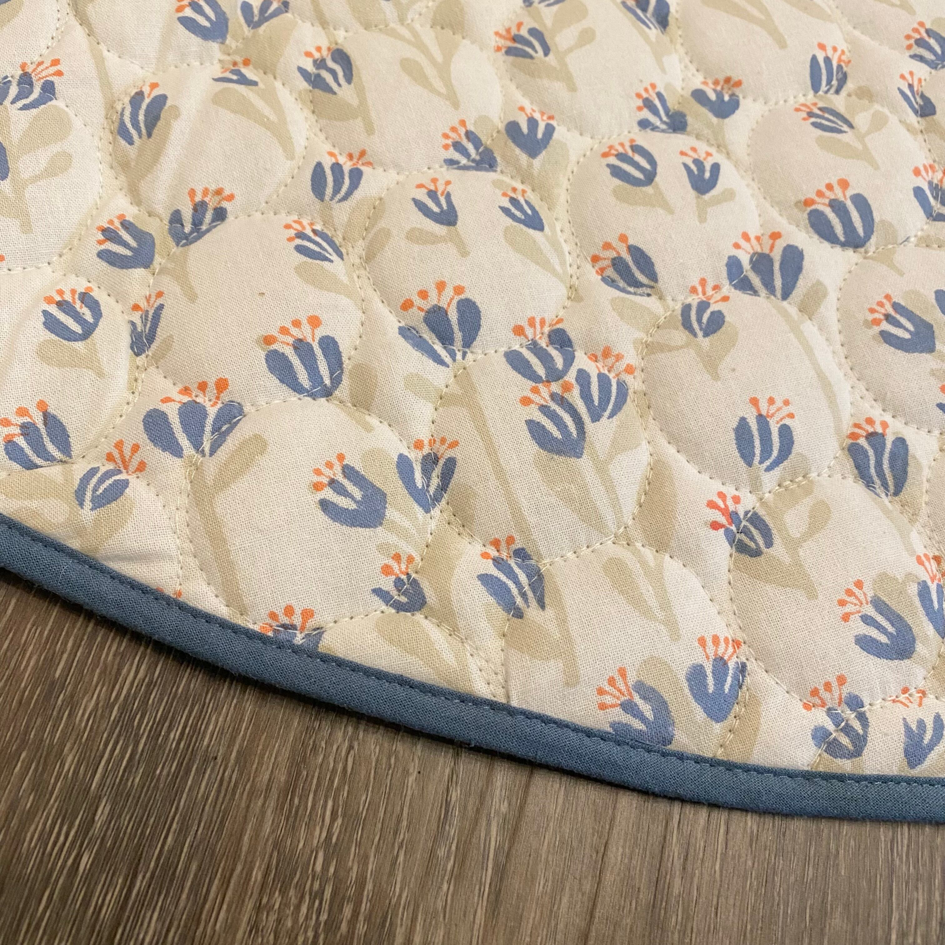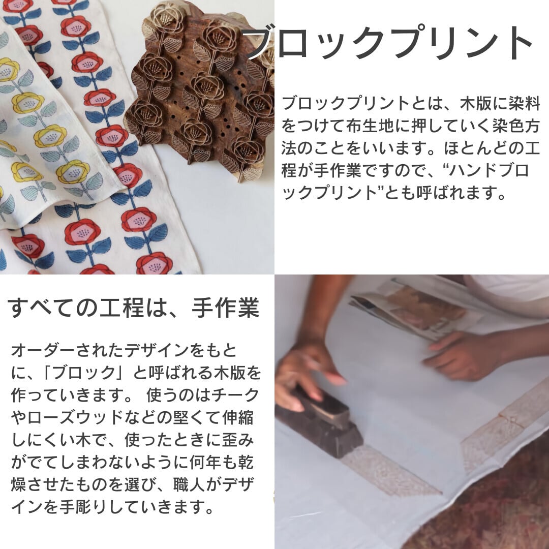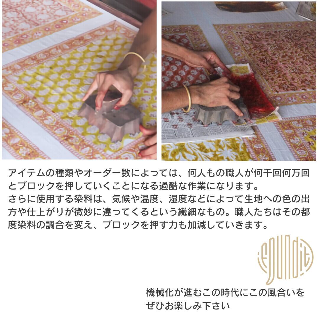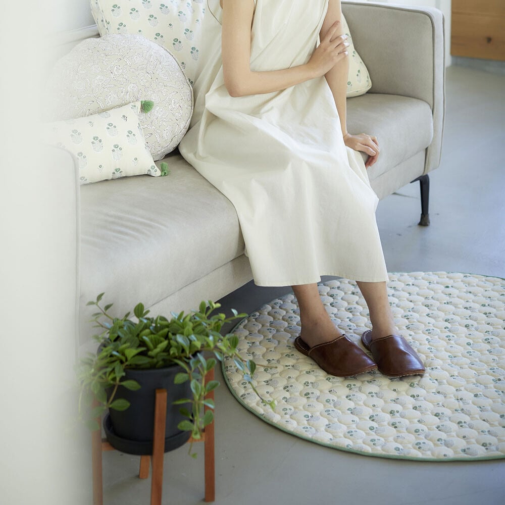 インドの伝統技法「ブロックプリント」で、ひとつひとつ手作業で模様が施された円形マットです。