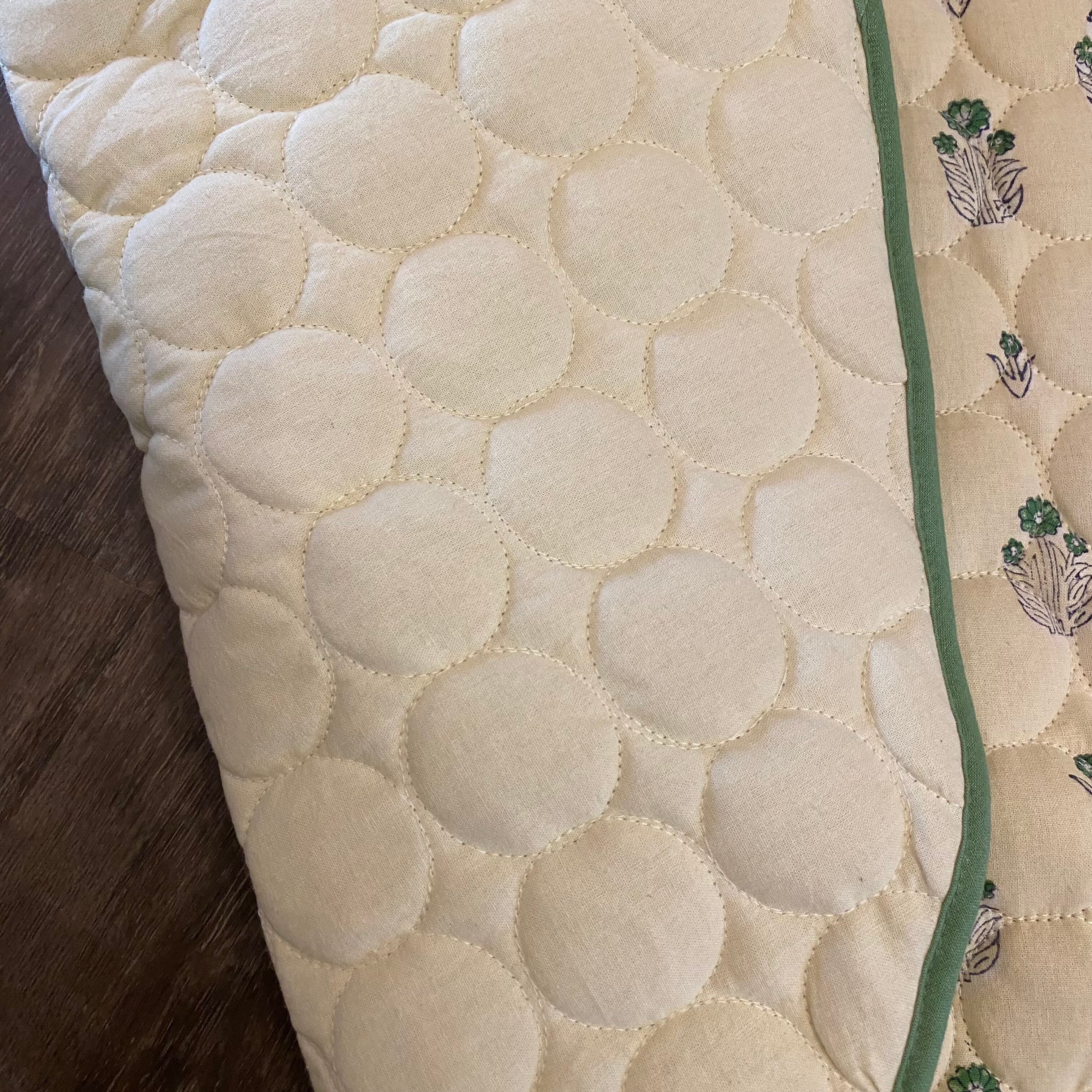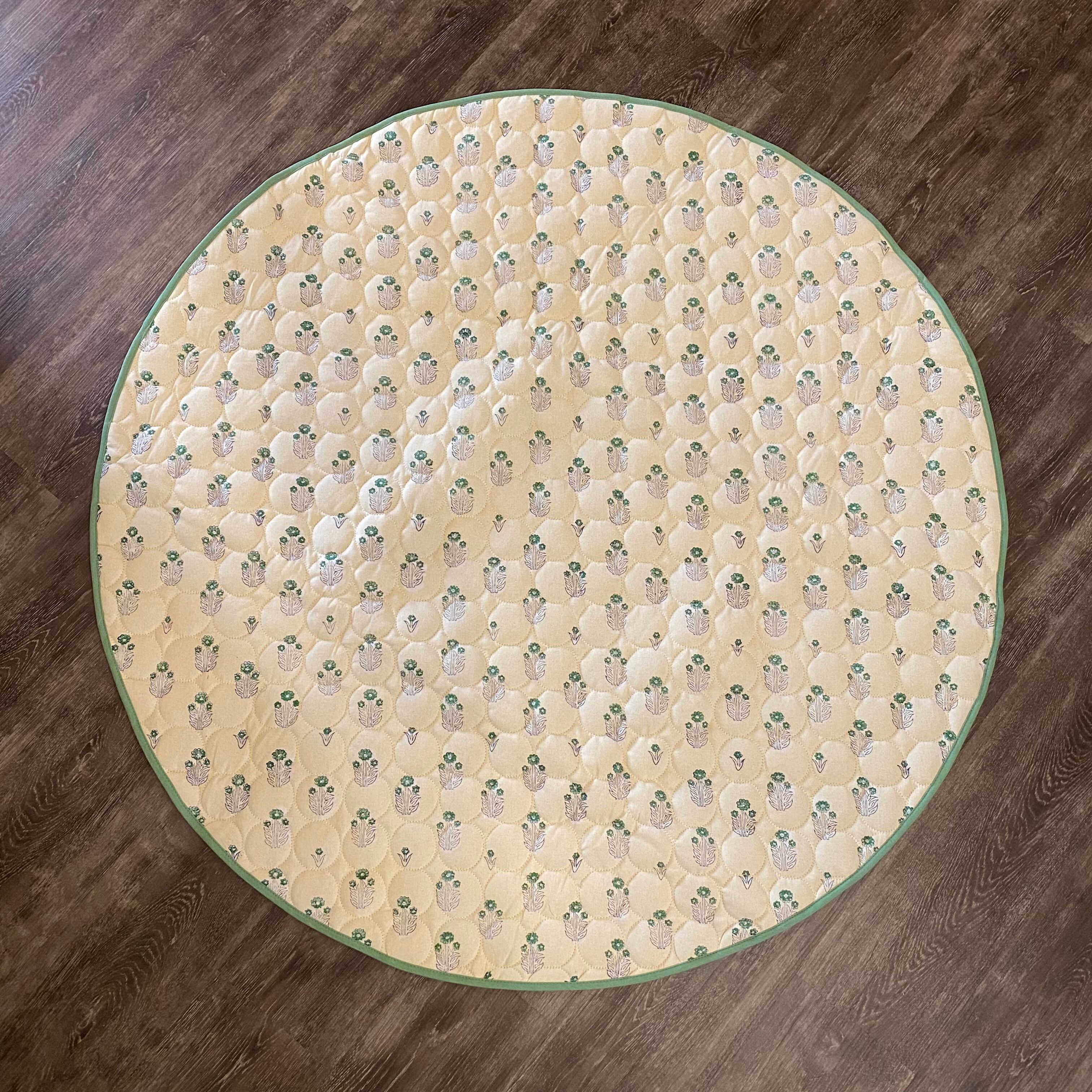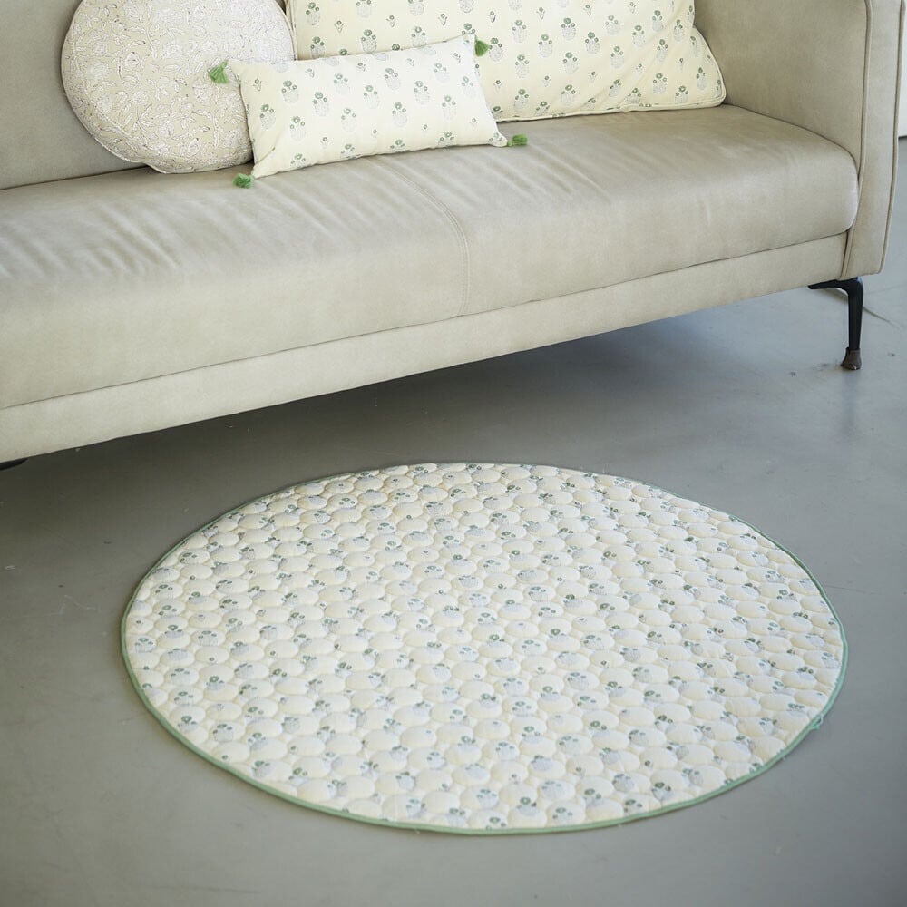 インドの伝統技法「ブロックプリント」で、ひとつひとつ手作業で模様が施された円形マットです。