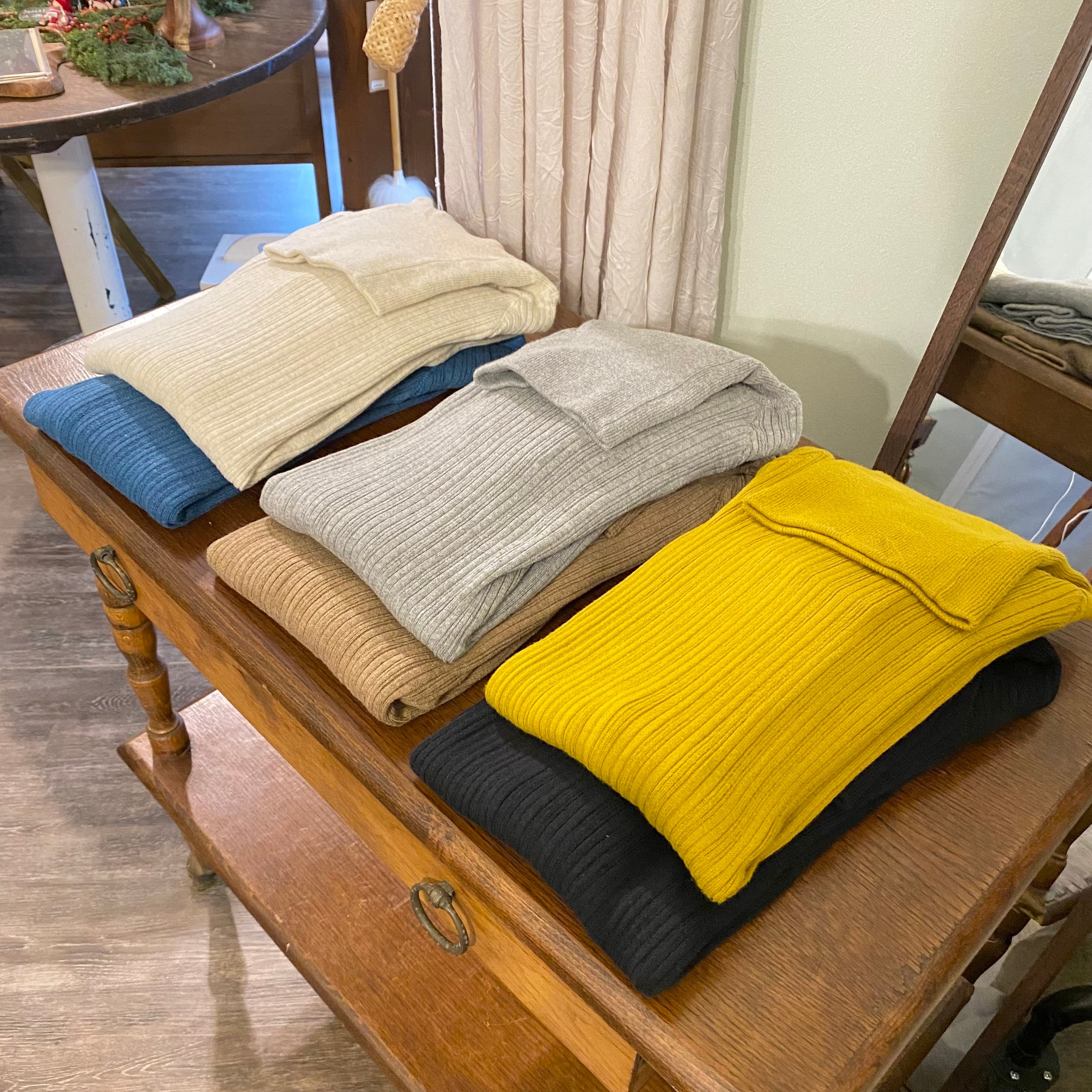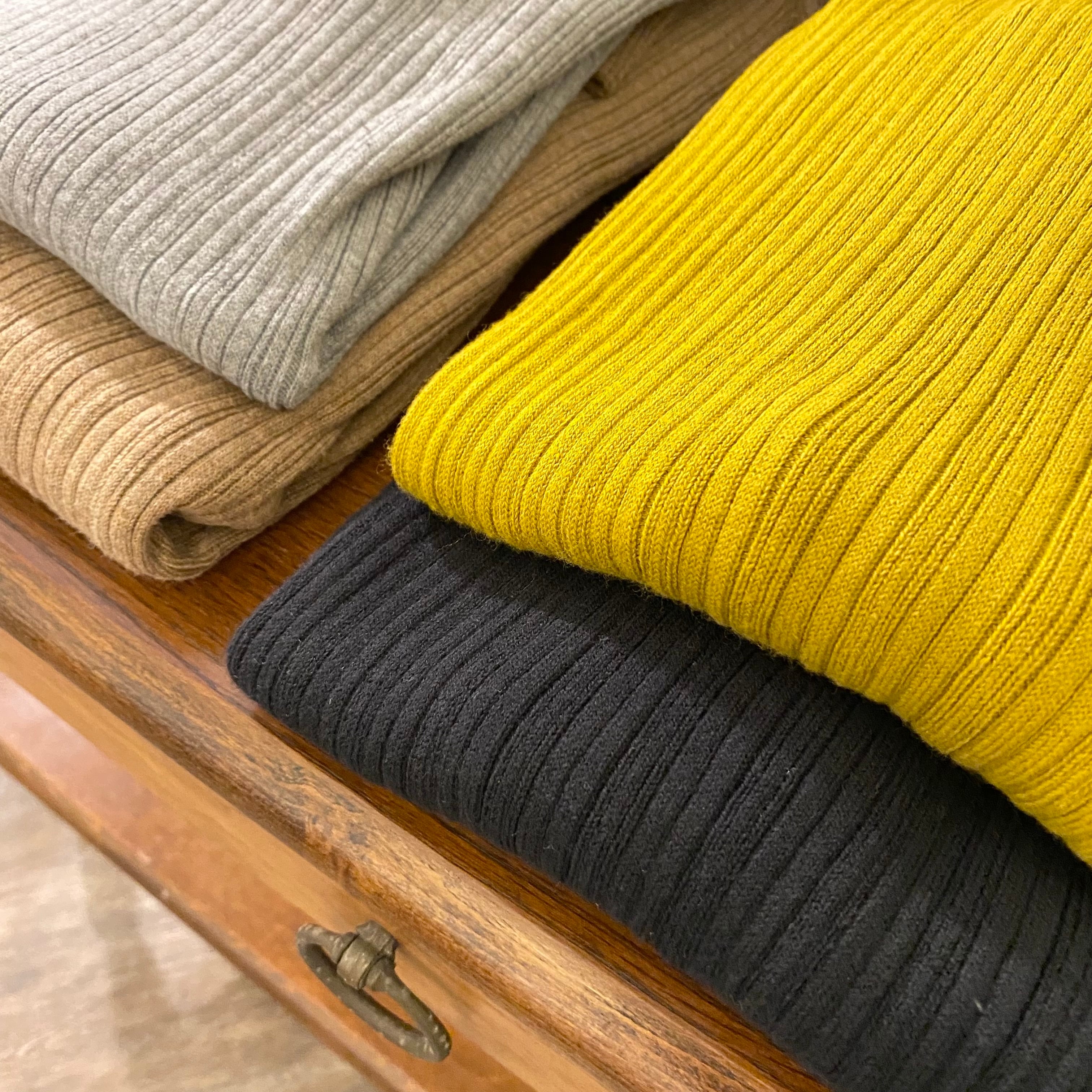 コットン95%でできたリブタートルは、ちくちくせず、伸びがよく、小柄な方からゆったりめの方まで心地よく着ていただけます。