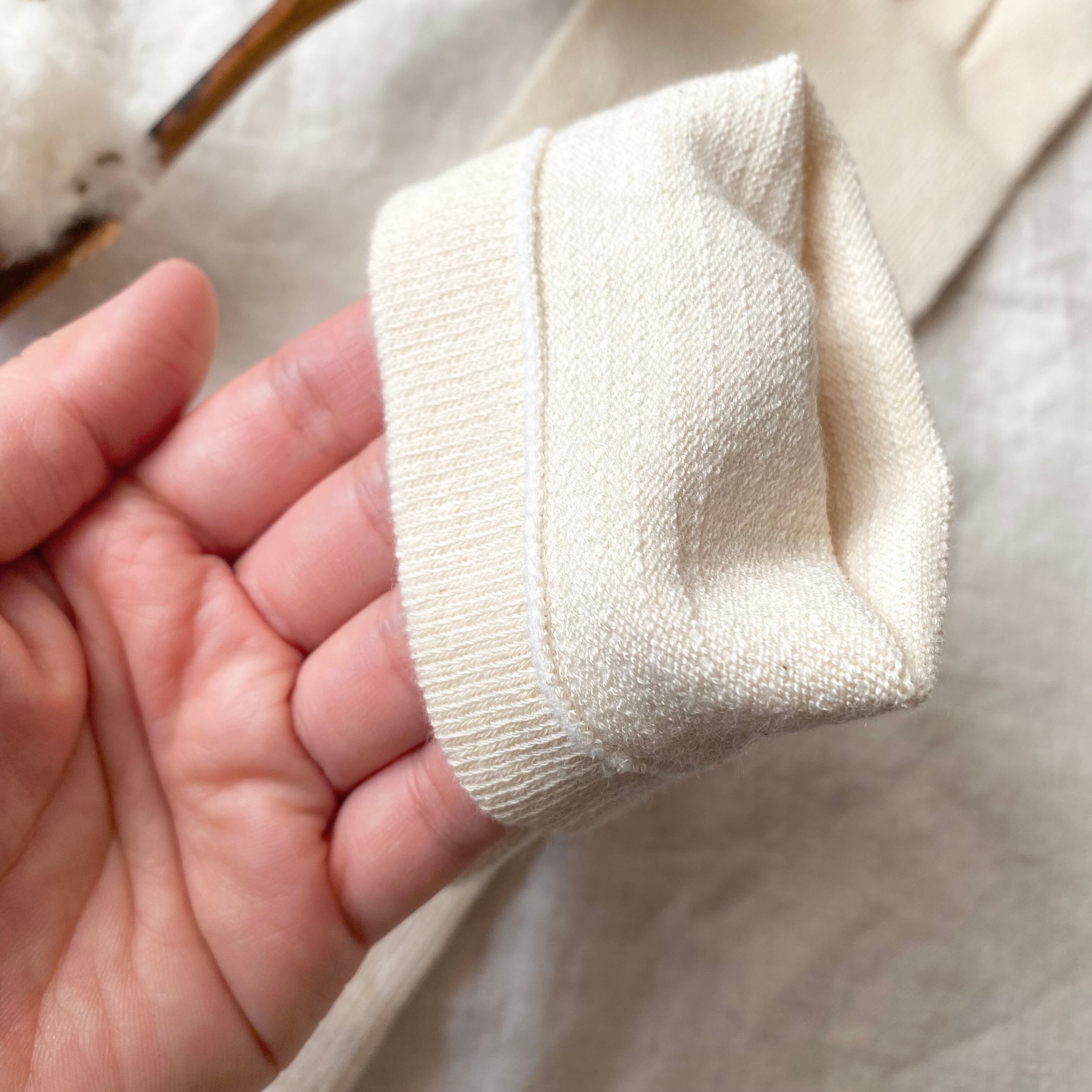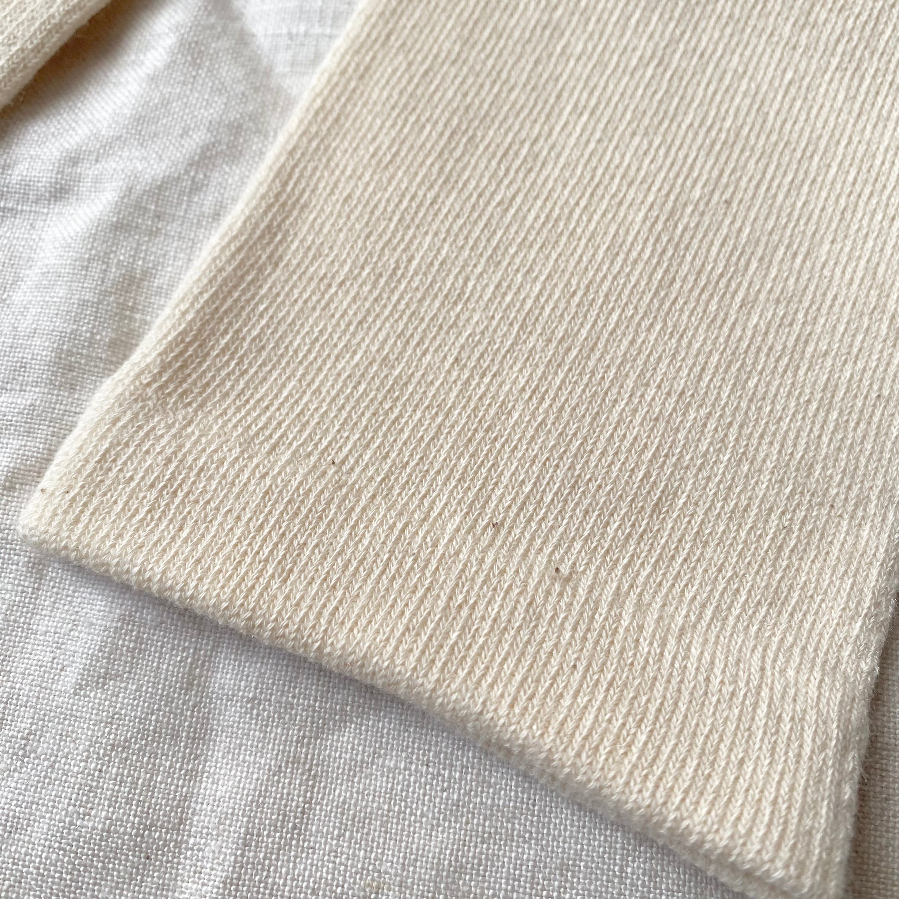 ほんの少し伸びは控えめですが、気にならない程度で心地よく、編み目が細かく丈夫なので、長くご愛用いただけます。