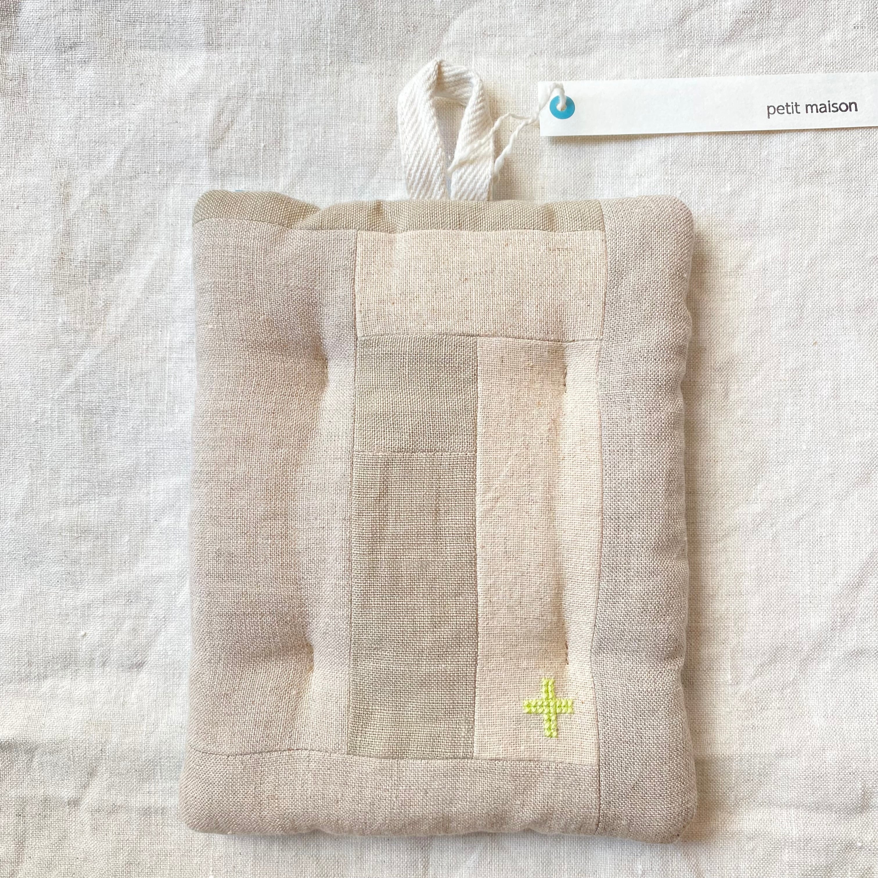 布小物作家 petit maison さんの、ナチュラルなリネンのパッチワークがほどこされたポットマットです。