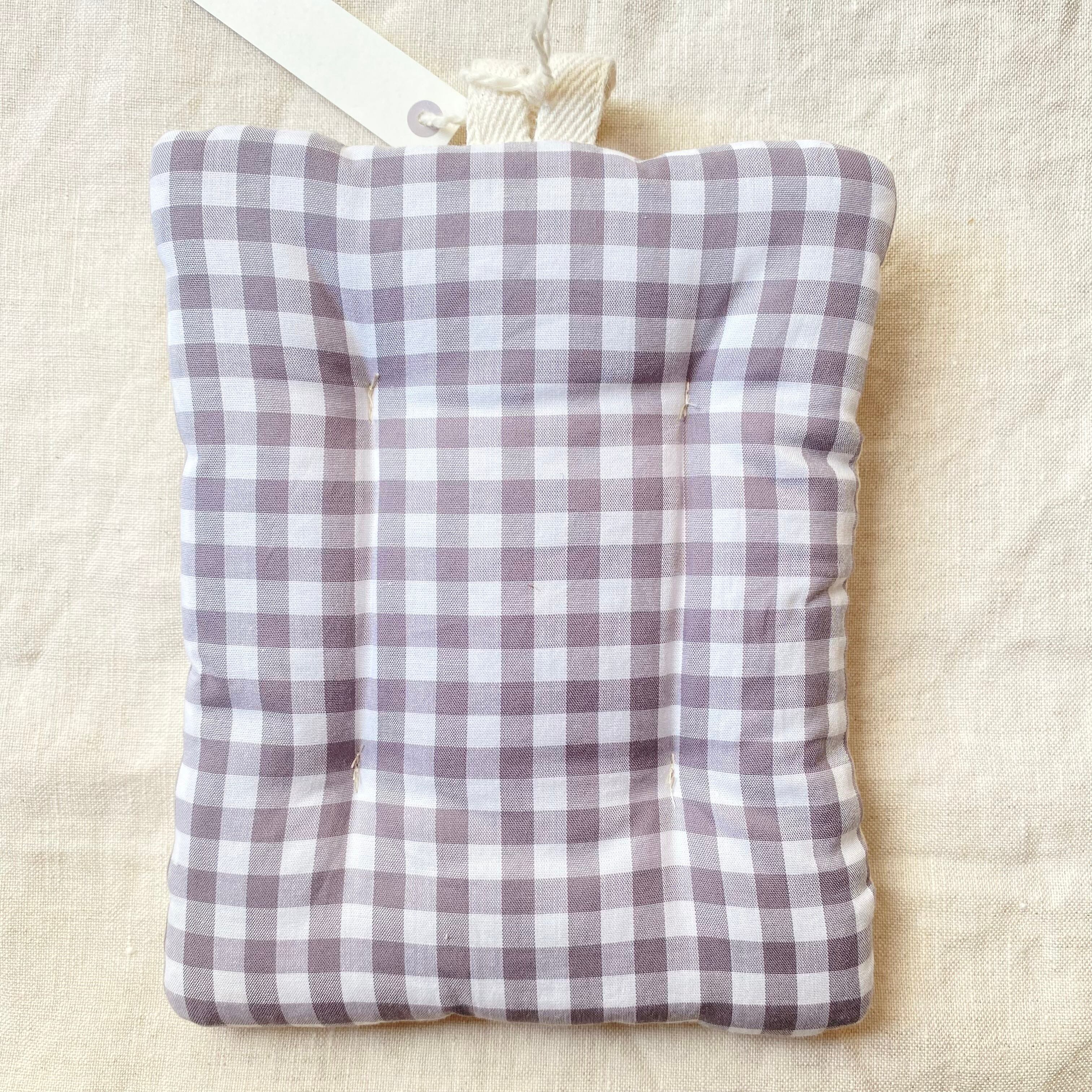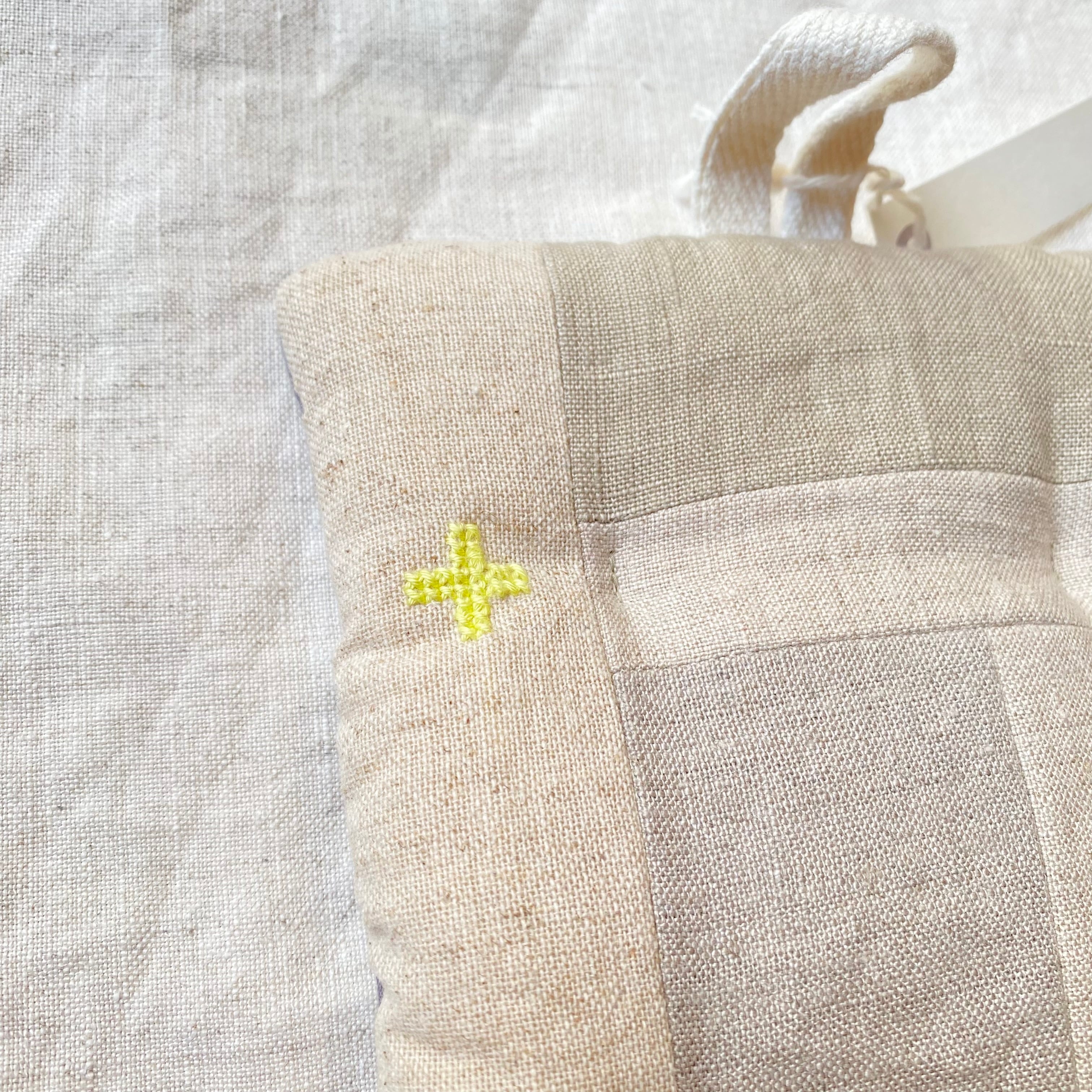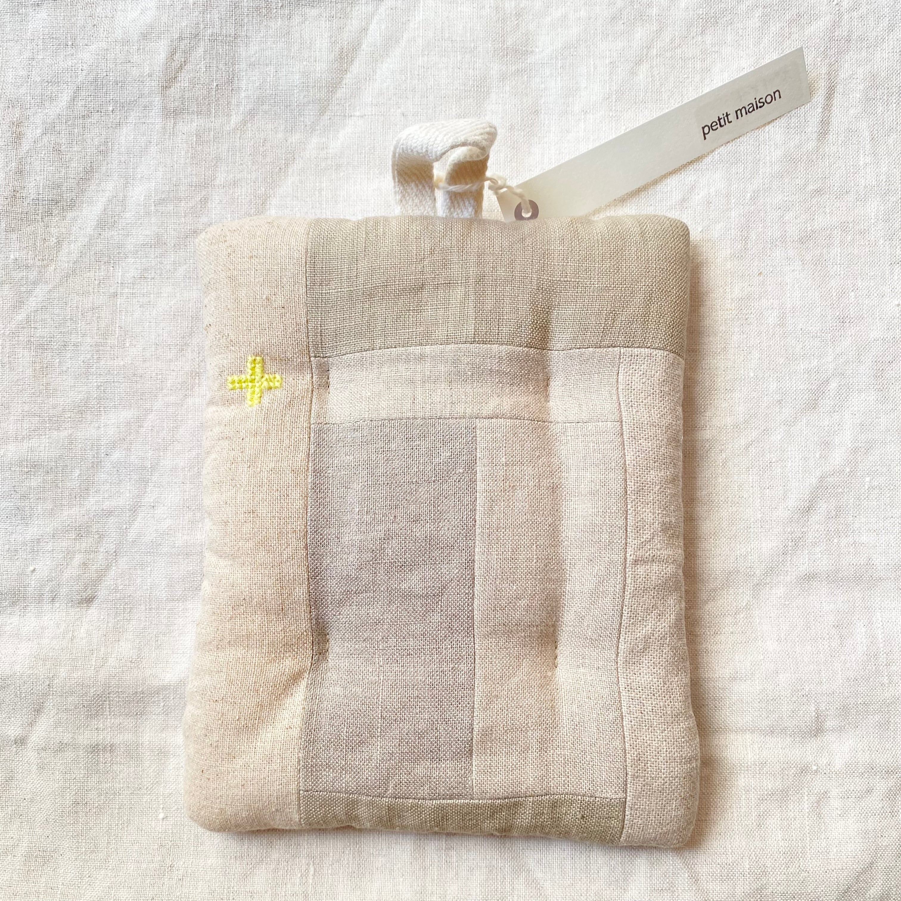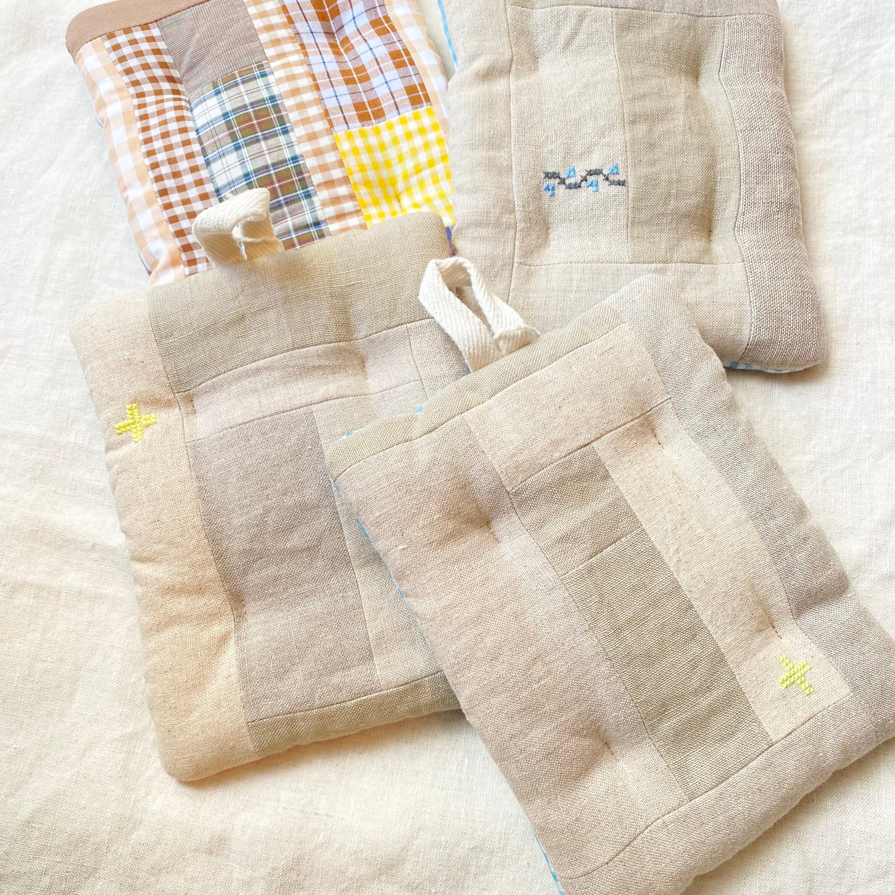 布小物作家 petit maison さんの、ナチュラルなリネンのパッチワークがほどこされたポットマットです。